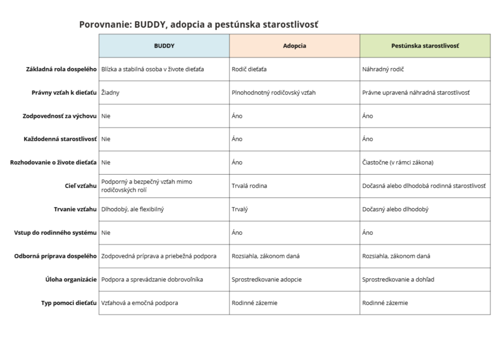 Byť pre dieťa dôležitým dospelým však nutne neznamená vstupovať do jeho rodiny ani preberať rodičovskú rolu. Medzi adopciou, náhradnou rodinnou starostlivosťou a dobrovoľníckym BUDDY vzťahom existujú zásadné rozdiely – v miere zodpovednosti, právnom postavení aj v zmysle vzťahu samotného.
